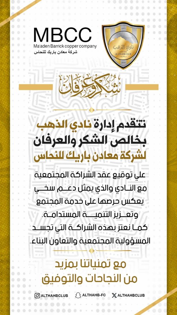 تتقدم إدارة #نادي_الذهب بخالص الشكر والتقدير لشركة معادن باريك للنحاس على توقيع عقد الشراكة المجتمعية مع النادي، والذي يمثل دعمًا سخيًا يعكس التزامها بخدمة المجتمع وتعزيز مبادئ التنمية المستدامة. ويؤكد #نادي_الذهب اعتزازه بهذه الشراكة التي تجسد المسؤولية المجتمعية والتعاون البنّاء، وتأتي امتدادًا للجهود في بناء شراكات فاعلة تسهم في خدمة الرياضة والمجتمع.