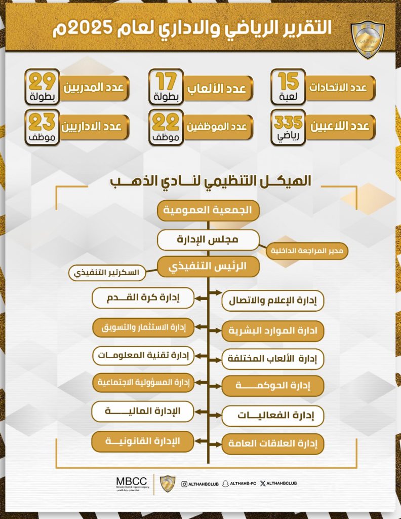 م بحمد الله عقد الجمعية العمومية العادية لنادي الذهب يوم الاثنين الموافق 28 سبتمبر 2025م عند الساعة 4:00 مساءً عبر منصة الجمعيات العمومية، وذلك برئاسة رئيس مجلس الإدارة الأستاذ خالد العبري، وبإشراف ممثل وزارة الرياضة الأستاذ منصور البهيجان، وبحضور أعضاء الجمعية العمومية والرئيس التنفيذي للنادي، وذلك بعد اكتمال النصاب القانوني لعقد الجمعية. وينشر تقريره المالي.